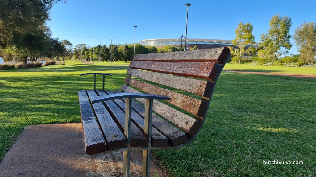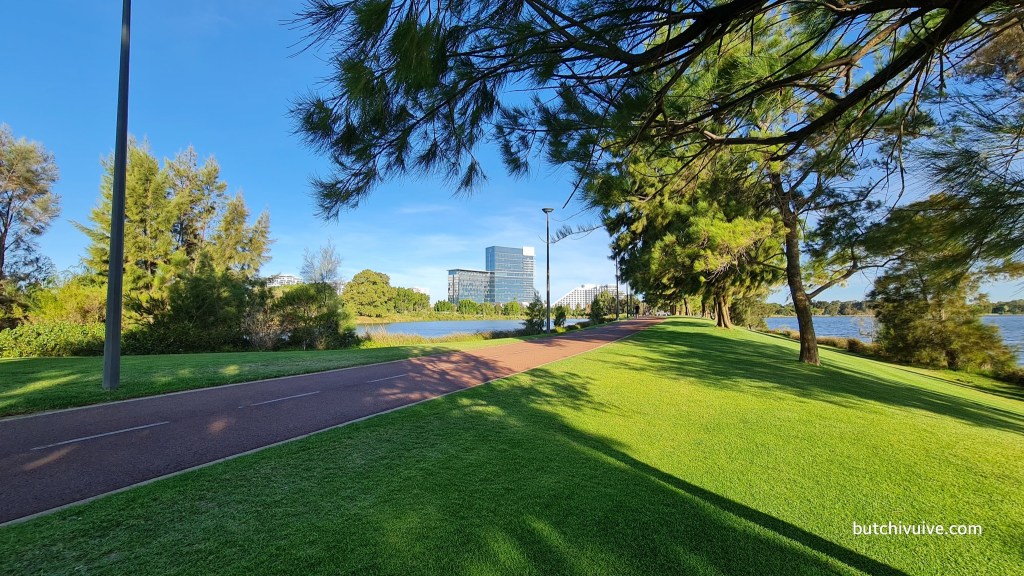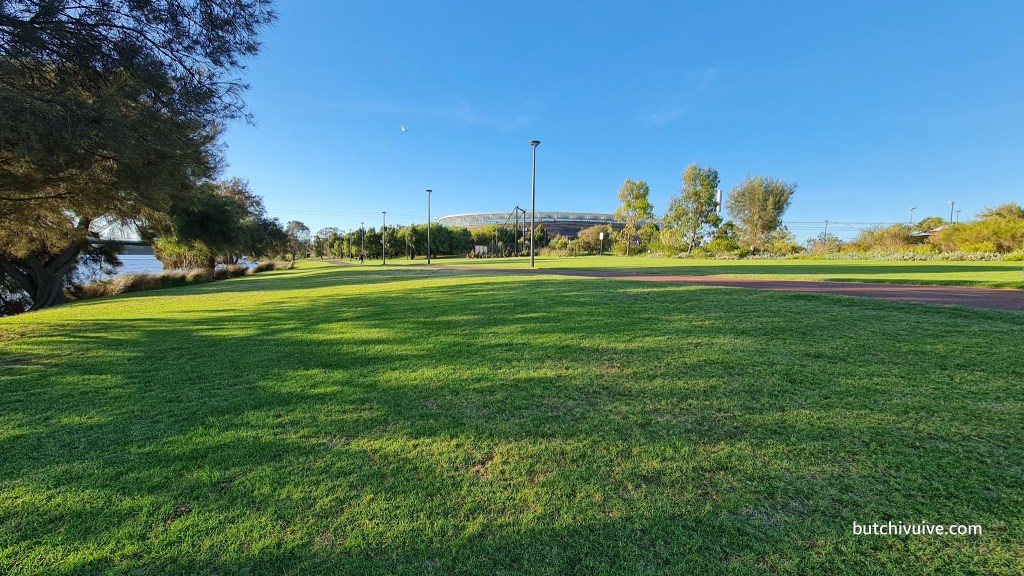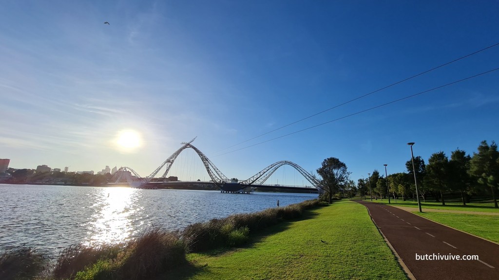 Vậy là mình quyết định thoát khỏi cao tốc và lái tự do cho hết ách tắc. Cuộc đời tuyệt vời đã đưa mình tới Windan Bridge và Optus Stadium bên bờ sông Swan thơ mộng trong ánh nắng chiều. Những cơn gió mát cùng hơi ẩm của con sông kết hợp với khung cảnh xanh mướt của những thảm cỏ và con sông làm tâm hồn dịu lại.