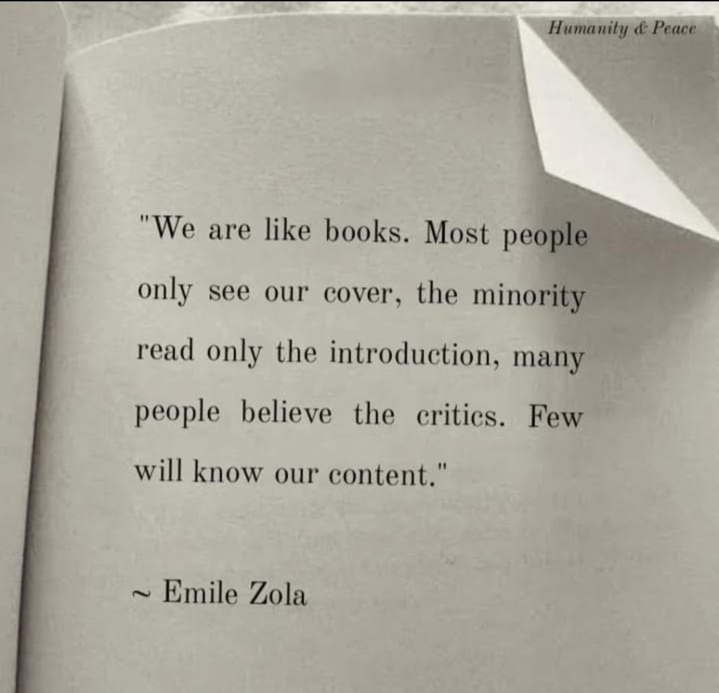 “Chúng ta như những cuốn sách. Đa phần sẽ chỉ nhìn vào cái bìa sách, số ít hơn thì chỉ đọc phần giới thiệu, nhiều người khác thì lại tin vào những phê phán. Chỉ có một ít người sẽ thực sự đọc và biết nội dung cuốn sách viết gì.” – Emile Zola-