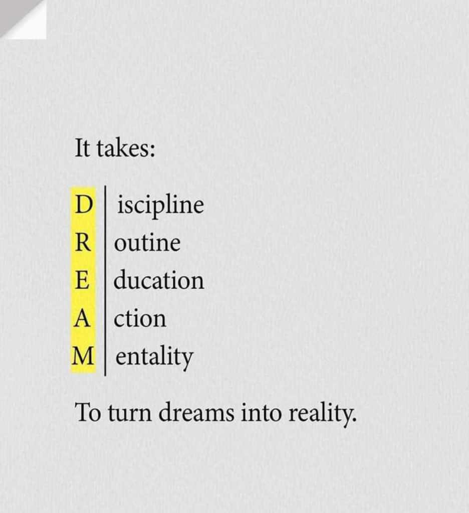 Mentality: it is characteristic attitude of our mind or way of thinking about our dream. Some adjectives are needed to remember: Positive, Resilient, Fortitude, Patient, Open-minded, Flexible, Enjoyable, collaborated, kind and compassionate.
