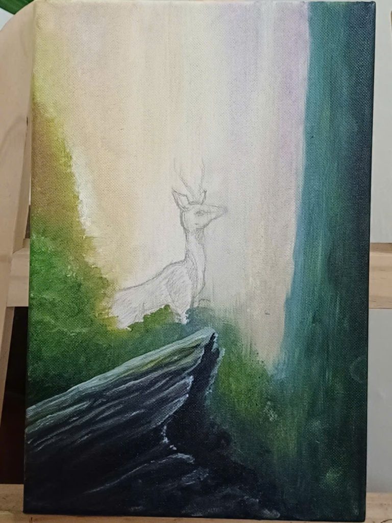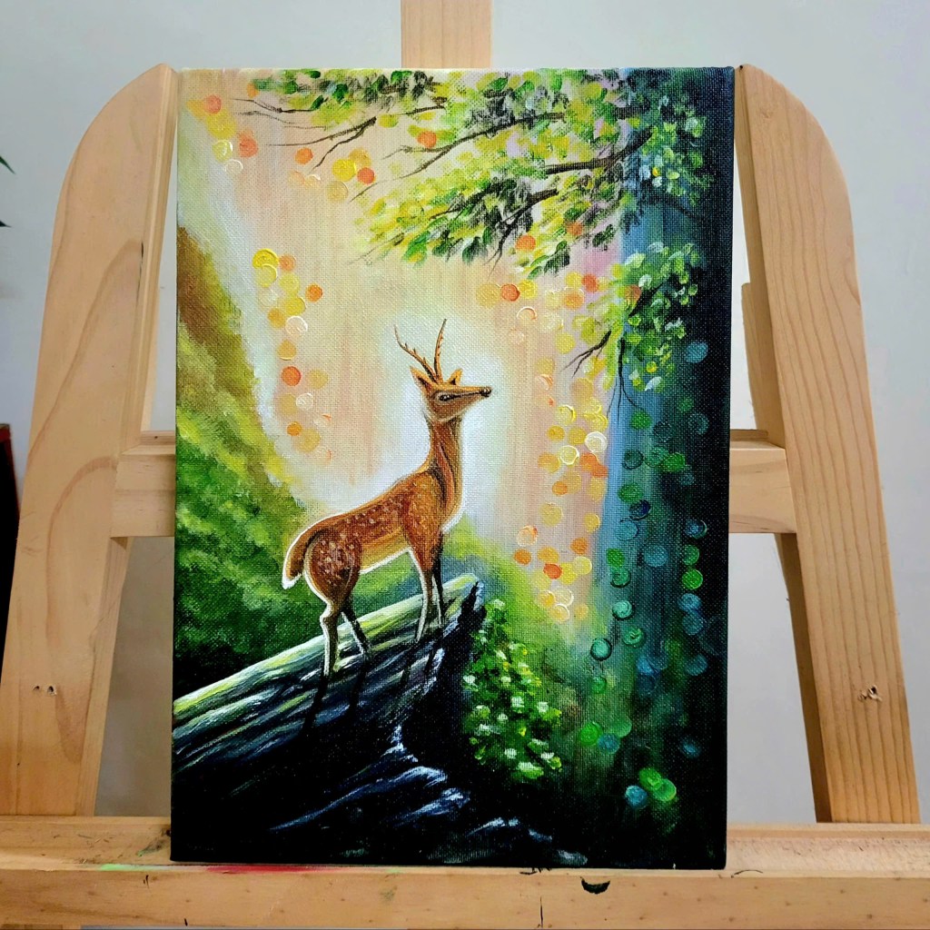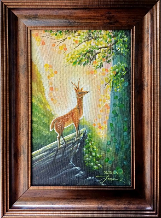 When I painted this scene, the image of the lone deer standing on the edge of the rock came to me like a gentle whisper from Scripture. Psalm 42 has always stirred something deep within me: “As the deer pants for streams of water, so my soul pants for you, O God.” As I laid each brushstroke, I felt as though I was painting not just a creature of the forest, but the very longing of the human heart.